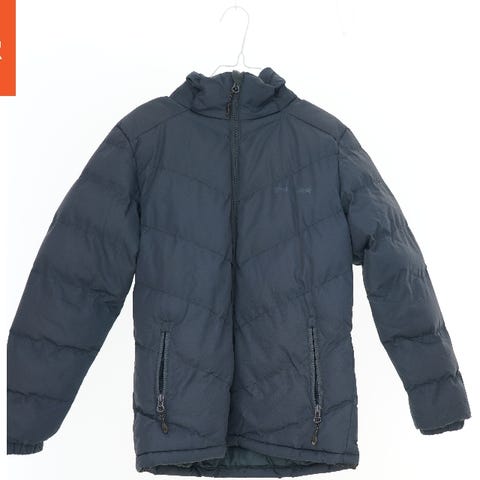 Sort vinterjakke med lynlås og hætte. Jakken har et quiltet mønster og justerbare snore ved hætten. Den er designet til at holde varme og beskytte mod koldt vejr.