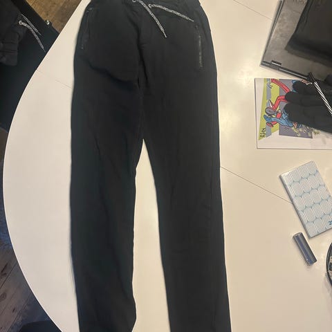 Et par lilla sweatpants med elastik i taljen og ved anklerne. Der er snørebånd i taljen for justering. Bukserne har lommer på siderne.