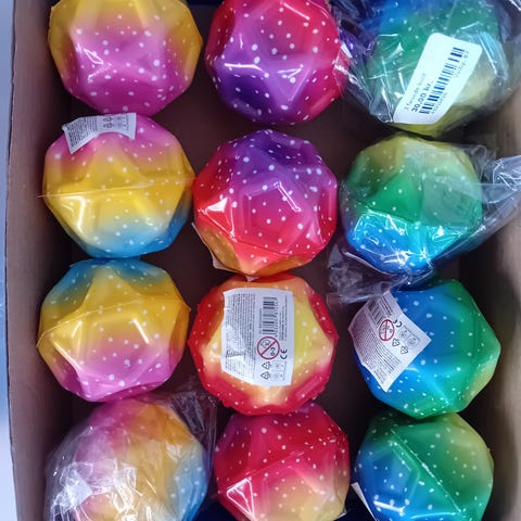En farverig aktivitetsbold designet til babyer. Bolden har en diameter på 13 cm og er dekoreret med forskellige farvede, teksturerede flader, som stimulerer barnets sanser og motorik. Bolden kan vibrere og lave lyd. Produktet er fra Bright Starts, hvilket fremgår af teksten på bolden.