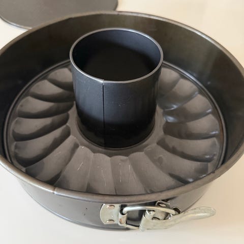 Denne springform bageform er lavet af metal og har en diameter på 20 cm. Den har en praktisk låsemekanisme, der gør det nemt at fjerne kagen, når den er bagt. Bunden har en mønstret overflade, som forhindrer dejen i at brænde fast. Der er synlige brugsmærker og lidt misfarvninger på formen, hvilket indikerer, at den er blevet brugt før.