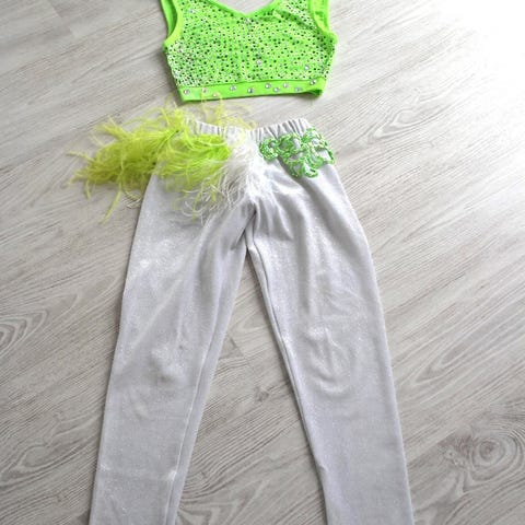 Dansetøj, Flot disco dragt - top i hvid blonde på hvid lycra og bukser i turkis stræk velour. Masser af rhinsten i crystal AB, turkis og hematit. Masser af enkelt påsyede frynser. Feltet nederst på venstre bukseben og manchetterne er lidt stive pga de mange rhinsten. Dragten er kun brugt 3 gange. Str XS med indsyet bh i str 70A.