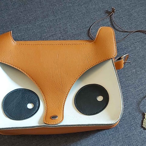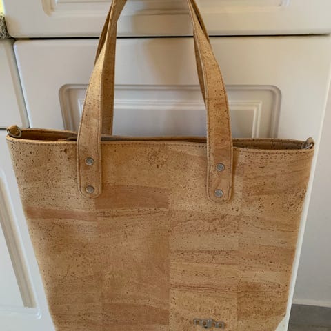 Net, HEKS design, Fluesvampe I dans over hele fladen.. Foret med gyldnet små ternet stof (har en inderlomme). Har lange hanke ( 72 /36 cm), så det kan bæres over skulderen.