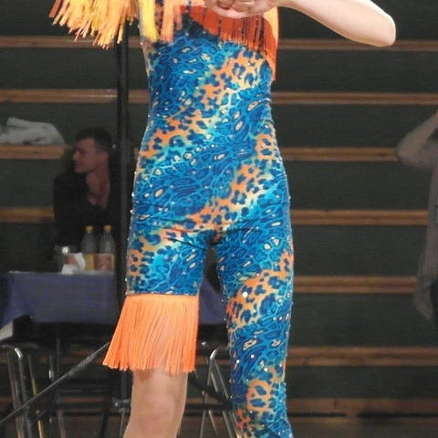Turkis og multifarvet lycra med masser af frynser.