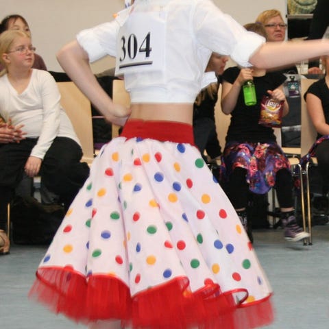 Flot jitterbug kjole i sort/hvid prikket elastisk stof med pink tyl skørt.