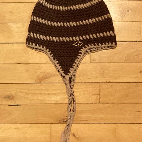 Hjemmestrikket hue med kvast. Omkreds: 58 cm.