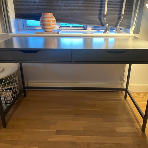 IKEA Arne Jacobsen skrivebord med bordplade i bambus og en skuffe. Skrivebordet har et enkelt design med metalben og en rund træknop på skuffen. Velegnet til brug som arbejdsbord eller skrivebord.
