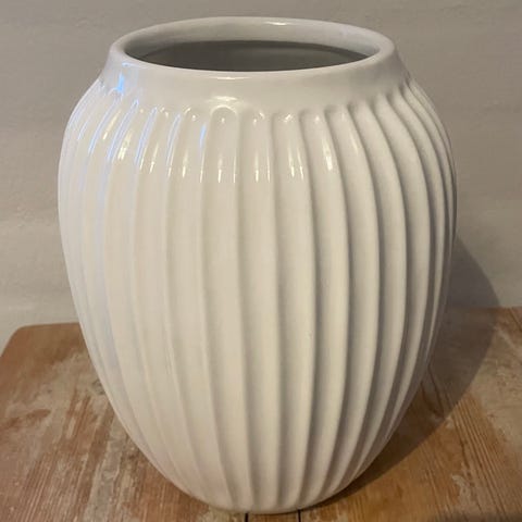 Kähler vase i hvid keramik med rillede detaljer. Vasen har en cylindrisk form og en neutral farve, der passer til forskellige boligindretninger.og vi skal bare af med den der vi ikke har noget at bruge den til og er i pæn stand og den bliver ikke sendt og den skal hentes på adressen