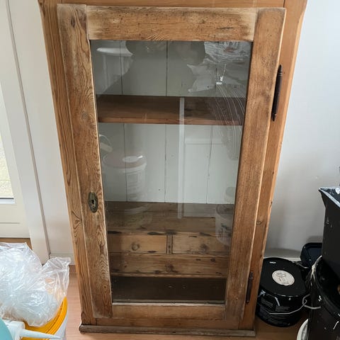Fint gammelt vitrineskab med små ruder. Der er to hylder og lås, der fungerer fint.