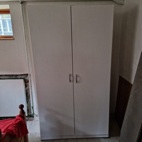 Flot garderobeskab som gives væk, da vi skal flytte. den ene låge har en lille skævhed, som sikkert kan laves, hvis man vil. Skabet fungerer og "kører" alligevel. Hurtig afhentning prioriteres.