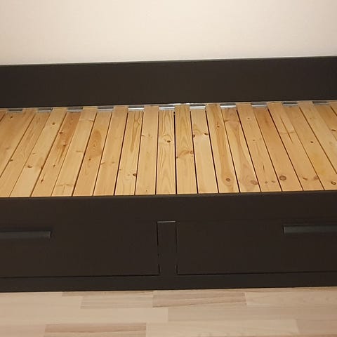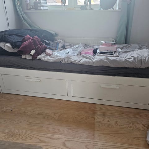 Meget lidt brugt seng. super fed og med flotte madrasser. En stor tyk lækker madras øverst og en lidt tyndere til gæster. Opbevaring under sengen