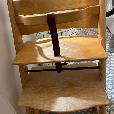 Stokke højstol i lyst træ. Højstolen har en justerbar fodstøtte og ryglæn med sikkerhedsbøjle. Der er kosmetiske brugsspor.