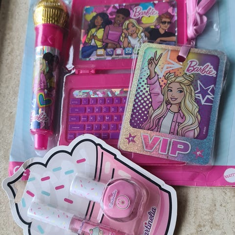 Sæt med Barbie-tema, der inkluderer en transparent pink plastlomme, en Barbie-inspireret stencil og et ark med glitrende klistermærker med forskellige motiver som guitar, tøj og tilbehør. Stencils kan bruges til at tegne motiver på papir eller andre materialer. Klistermærkerne lader børnene dekorere deres materialer med Barbie-temaer. Det hele kommer i en praktisk plastmappe til opbevaring og transport.