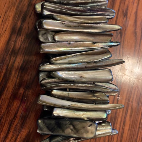 Armbåndet består af naturlige perlemor skaller, der er skåret i aflange stykker og det er samlet med to indvendige elastikbånd, der gør det fleksibelt at tage af og på. Det har en samlet længde på 16 cm. Skallerne har en iriserende sort og blå nuance, som fanger lyset og giver en speciel glans.