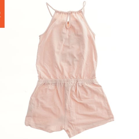 En sommerdragt med seler til børn, lavet i et blåt og rødt ternet mønster. Dragten har en applikation af en rød bil på venstre ben. Det har trykknapper på stropperne og siderne for nem justering.
