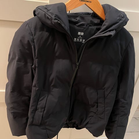 Uniqlo frakke i størrelse M til kvinder. Fremstillet i polyester med en grå farve og quiltet mønster. Designet til at give varme og komfort som yderbeklædning.