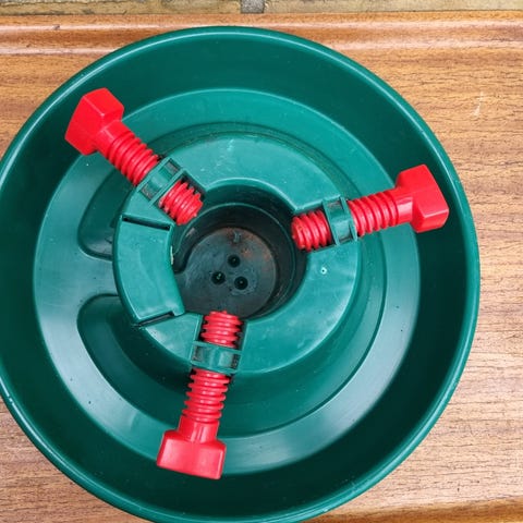 Denne genstand er en juletræsfod med en diameter på 31 cm. Foden er lavet af plast og har en grøn farve. Den har en central cylinder, hvor træet kan placeres, og tre metal skruer til at fastgøre og stabilisere træet. Foden kan holde vand, hvilket hjælper med at holde juletræet friskt længere.