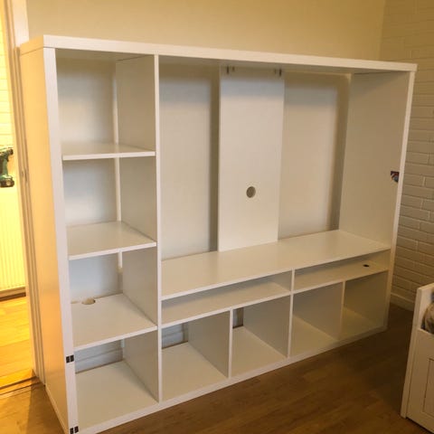 møbel med hylder . Møblet er i sort metal og har flere hyldeniveauer til opbevaring. Kan anvendes som reol eller opbevaringsløsning i forskellige rum.