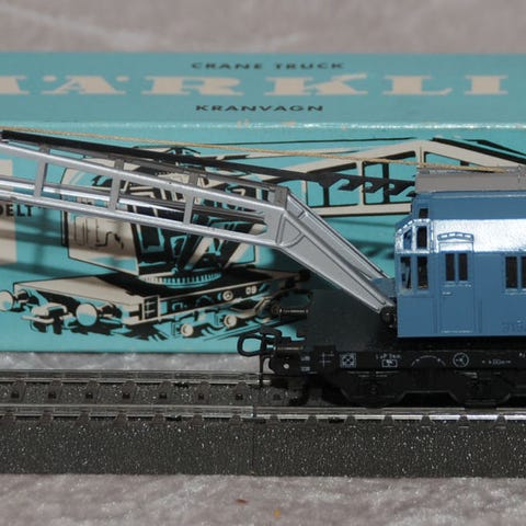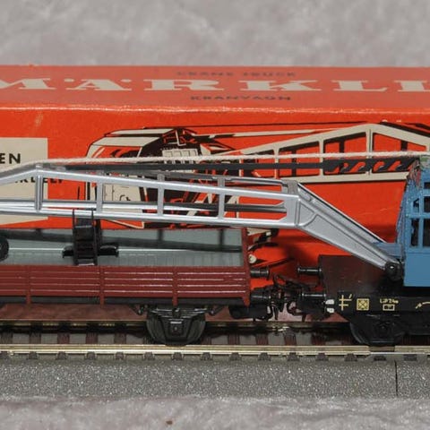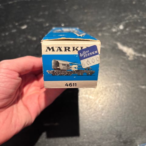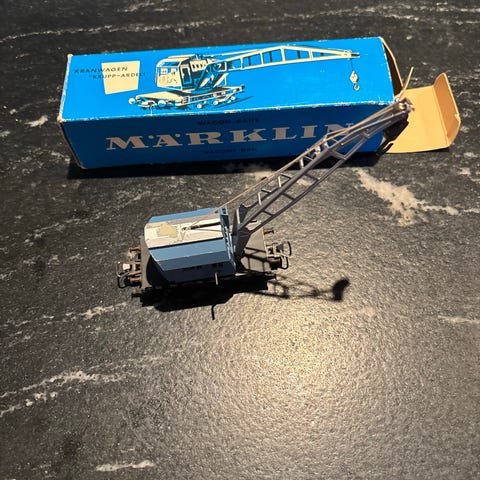 Kranen er brugt. Bortset fra lidt rust på denne ene puffer og den ene kobling, fremstår kranen i pæn stand. Koblinger passer til Märklin bøjlekoblinger. Leveres i original æske. Æsken mangler dog "låget" ene ende.
