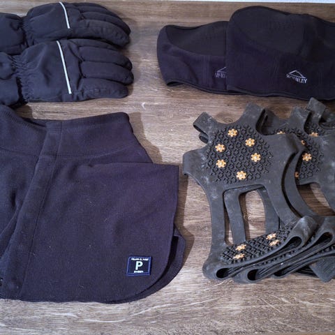 Et par sorte vinterhandsker med et indsyet stjernemønster foran. Hand skerne har justerbare klipsbånd rundt om håndleddet og snoretræk ved åbningen. Fronten er lavet af isolerende materiale, mens bagsiden har et mere tekstureret look. Handskerne måler 29 cm i længden.
