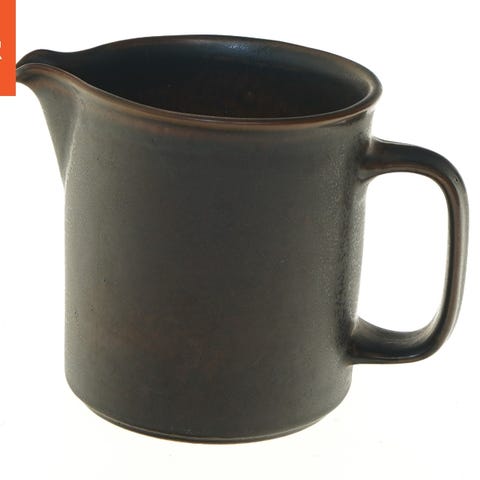 En lille keramikkande med en kapacitet angivet som 1 Gill. Kanden er lavet af glaseret porcelæn og har en diskret og klassisk form med en enkel hank. Den naturlige tone af keramikken gør den velegnet til både dekoration og funktionelle formål i køkkenet.