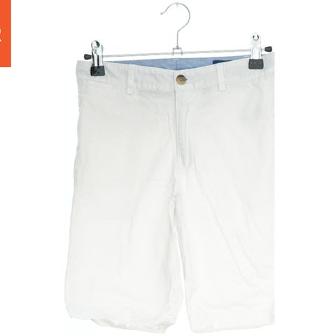 Khaki shorts lavet af et let beige stof. De har lynlåslukning med en knap foran. Der er bæltestropper til at bruge med et bælte, og designet inkluderer lommer foran og bagpå. Baglommerne har knaplukning, og der er et lille mærke med brandnavnet Polo.