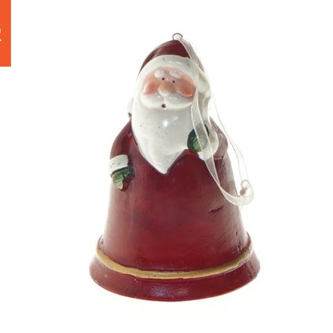 Dekoration af en lille figur med en rød, konisk hat og en hvid kjole med sorte stregdetaljer. Figuren hænger fra et rødt bånd og har lange, tynde ben med sorte sko. Dette dekorative objekt har en størrelse på 22x7 cm og kan bruges som julepynt eller hænges op som en del af indretningen.