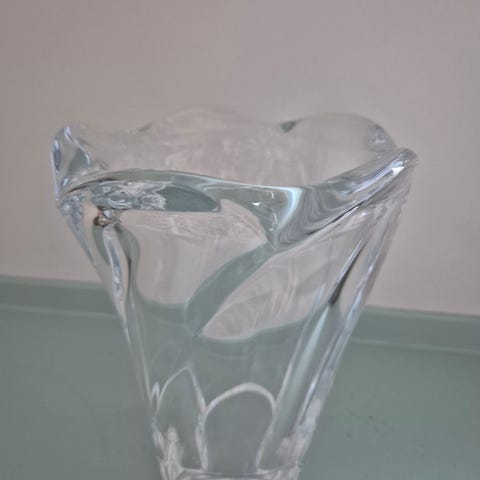 En vase lavet af blåt glas med et elegant og moderne design. Vasens størrelse er 15x8 cm. Den har en krone-emblemlogo på fronten. Under bunden kan der ses en tekst, men det kan være svært at tyde den fuldt ud fra billedet. Den er egnet til dekoration og kan bruges til blomster.