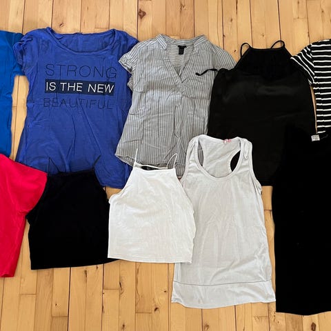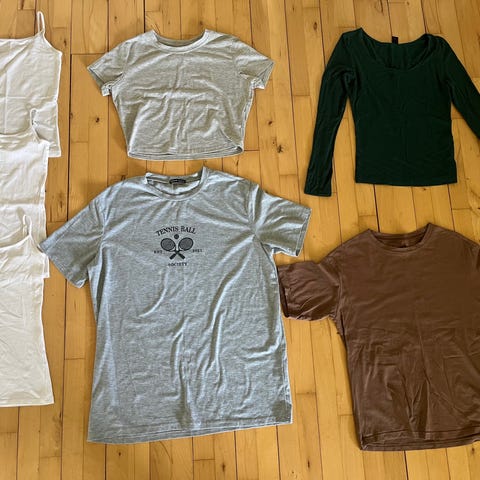 T-shirts, toppe og en kjole i forskellige farver, fx sort, hvid, grå, rød, lilla og brun. Nogle er med mønster og andre ensfarvede. De er str. 164 og i mærkerne H&M, Divided og Shein. De er alle i fin stand og kommer fra røgfrit hjem. Prisen er pr. stk.