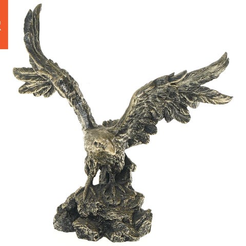 En detaljeret keramisk ørn figur, der måler 26 cm i højden. Den viser en ørn med udbredte vinger i en realistisk og dynamisk positur, stående på en base formet som klipper. Figuren er brun og skildrer naturlige nuancer, der fremhæver dens detaljer. Perfekt til dekoration eller som en samlergenstand.
