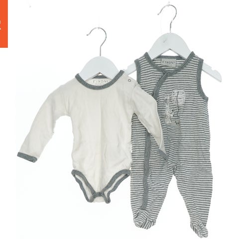En langærmet bodystocking i hvid med grå cirkusmønster, herunder telt, stjerner og forskellige dyr såsom elefanter og løver. Den har trykknapper på forsiden og mellem benene, og er designet til nem på- og afklædning.
