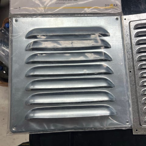 VVS jalousirist i hvid plastik pakket i en plastpose. Dimensionerne er 10x15 cm. Risten er designet til ventilationsformål og har lodrette ribber for bedre luftstrøm. Emballagen har en blå etiket med produktdetaljer inklusiv et prisområde og pos. nr. 3002010.