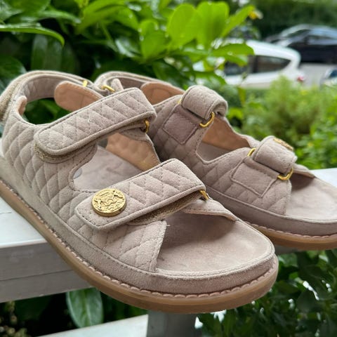 Sorte sandaler i størrelse 37. Sandalerne er lavet af læder med et quiltet mønster. De har to velcro-remme over foden og en velcro-lukning omkring anklen for at give en justerbar pasform. Sålene er robuste, hvilket giver god stabilitet ved gang. Der er en tekst indvendigt på sålen, der angiver brandet. Meget fin stand.