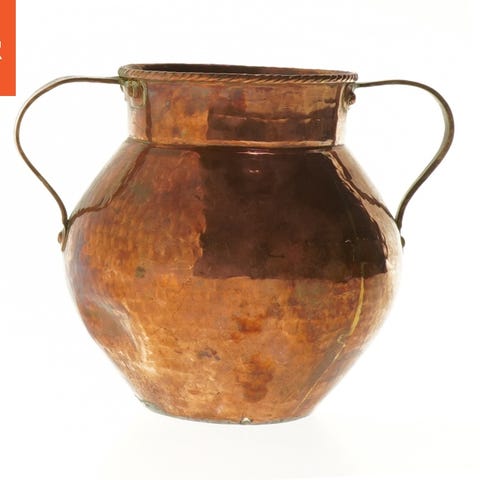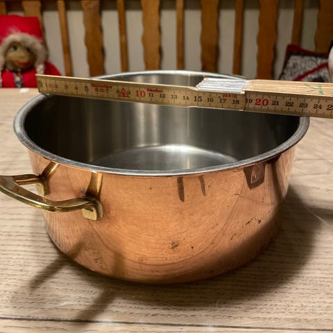 Denne kobbergryde har et låg og tre ben, som giver stabilitet. Gryden er rund med en diameter på 36 cm og har to bøjede håndtag på siden. Farven er en brun kobberfarve, typisk for materialet. Ideel til dekoration eller som praktisk køkkenudstyr.