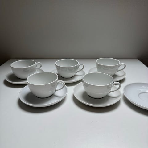 5 stk Pillivuyt Cecil kaffekopper (18 cl) med tilhørende underkopper.