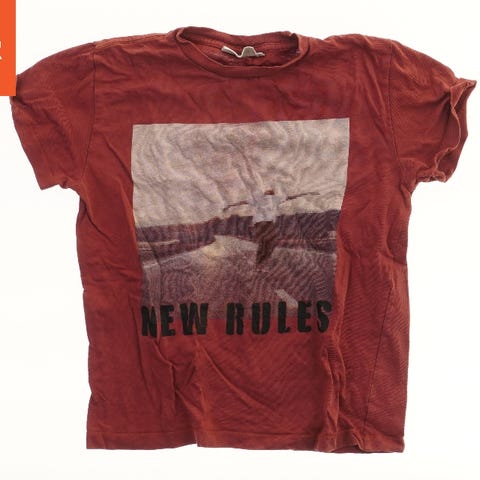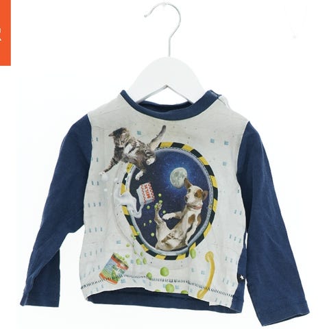 Kortærmet blå T-shirt med en trykt illustration af en ørken med to ryttere og en kaktus. Designet har også en orange sol og mærkelogo nederst på forsiden. T-shirten er ensfarvet blå på bagsiden.