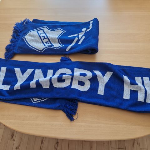 Et blåt fodboldhalstørklæde med teksten 'De Små Vikinger' og 'Lyngby BK'. Halstørklædet er 18x150 cm og har hvide frynser i kanterne. Det er designet med et vikingmotiv og klubbens logo, ideelt til fodboldfans.