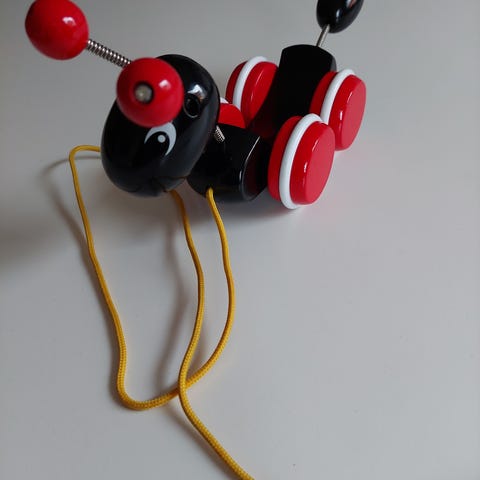 Det vist objekt er et træk-legetøj formet som en bi. Det har en sort og gul stribet krop, med røde hjul og antenner. Der er en snor fastgjort til legetøjet, som gør det muligt at trække det langs gulvet. Legetøjet har også beige vinger og hjul på siderne.