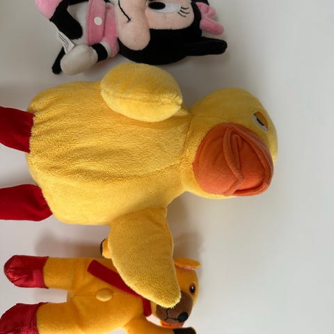 Dette er et plyslegetøj, der forestiller Minnie Mouse, en populær Disney-figur. Legetøjet måler 30 cm i højden. Det har en pink kjole med hvide prikker, gule sko og karakteristiske store ører med forskellige mønstre: det ene sort med hvide prikker og det andet med farverige mønstre. Der er et label med 'Minnie' på forsiden af kjolen.