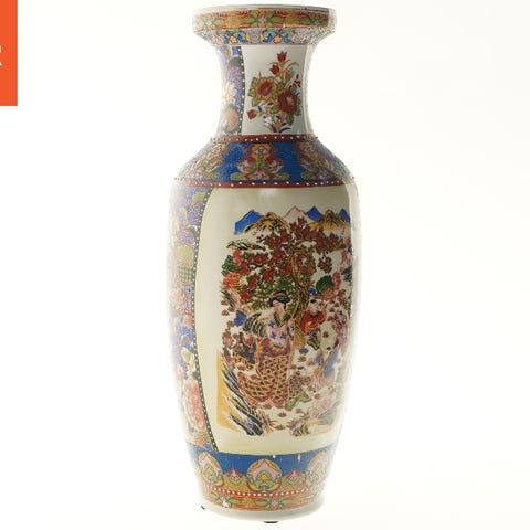 Dekorativ håndmalet fajance-/keramikvase med blomster og to hanke.
