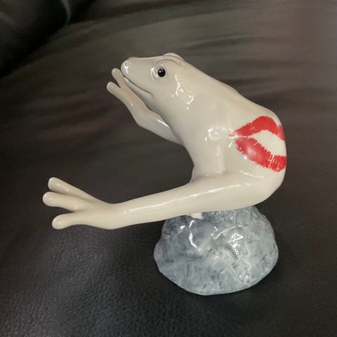 Royal Copenhagen figur forestillende en frø med guld siddende på en blå keramisk sten Figuren er 10 cm høj.