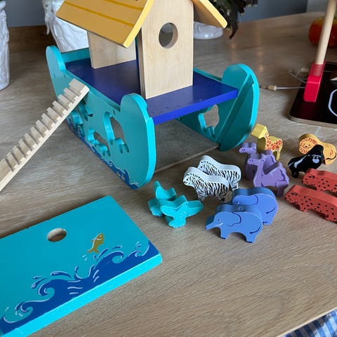 En puttekasse med dyr, mennesker i bedste Noahs ark stil.