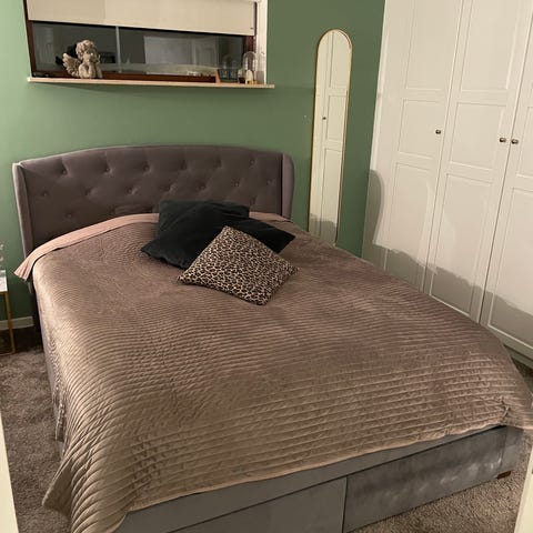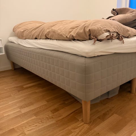 IKEA seng med madras og hovedgærde. Sengen har en polstret hovedgærde i grå farve og ben i træ. Madrassen er hvid og quiltet, tilpasset sengen. Topmadras følger.
