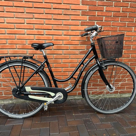 Kildemoes Bycykel til kvinder med lav indstigning. Cyklen har en lilla ramme, forkurv i sort metal, og er designet til bykørsel.