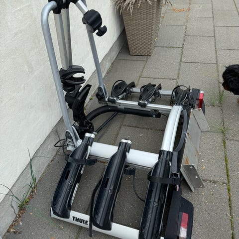 Thule Cykelholder til bil med plads til 3 cykler. Cykelholderen har en aluminiumsramme og er udstyret med stropper til fastgørelse af cyklerne. Den har elektrisk stikforbindelse til bilen for lys og signal. Designet til montering på bilens anhængertræk. Kan vippes.