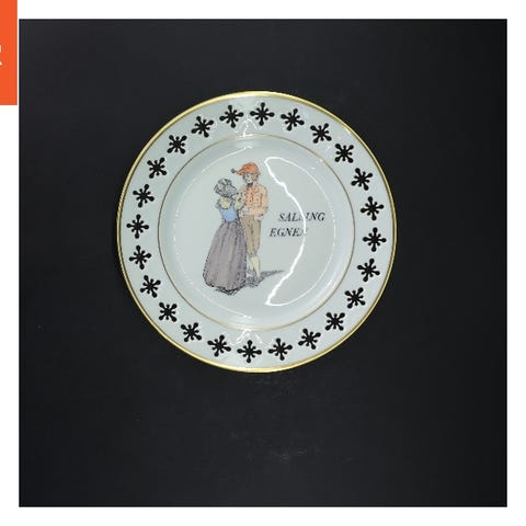 Dekorativ porcelænstallerken med motiv af folk i traditionel klædedragt fra Hedelbo Egnen. Tallerkenens kant er prydet med mønster og har en gylden kant. Der er tekst på bagsiden, der indikerer det er et håndmalet produkt fra Bing & Grøndahl. Størrelsen er Ø 22 cm. Denne tallerken er velegnet til dekoration og samling.