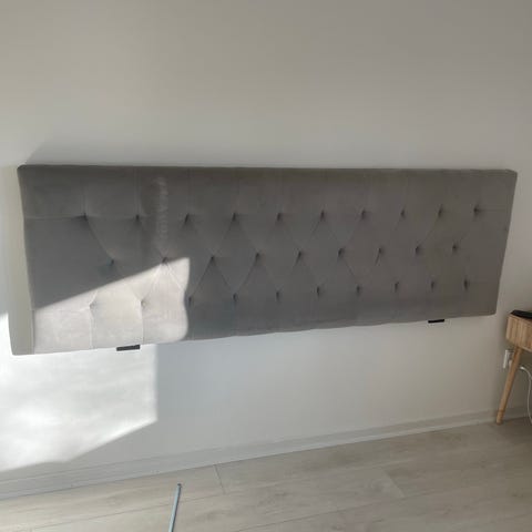 Ellos sengegavl i blå stof med knapdetaljer. Passer til dobbeltseng 180cm og kan bruges som støtte ved hovedenden af sengen.