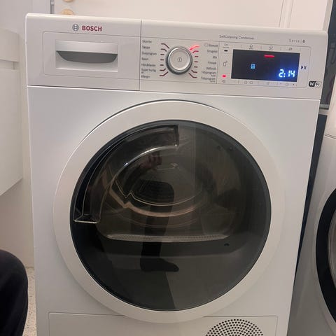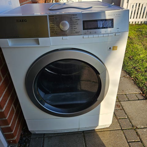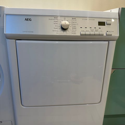 AEG Andet tørretumbler og ASKO vaskemaskine i hvid farve. Tørretumbleren har en rummelig tromle og flere indstillingsmuligheder for tørring. Den er designet til effektiv tørring af tøj og tekstiler.
