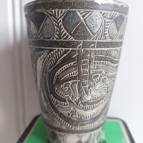 Miniature samovar i tin. Formentlig hollandsk og antik. Den har fået et tryk i korpus ved det ene af de tre ben, ligesom kanten på låget er lidt bulet. Sidstnævnte ses dog ikke, når låget er på. Højde 18 cm.