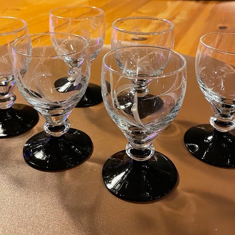 Holmegaard portvinsglas Ranke, med sort fod. Glasset er fremstillet i klart glas med dekoration og en sort farvet fod.