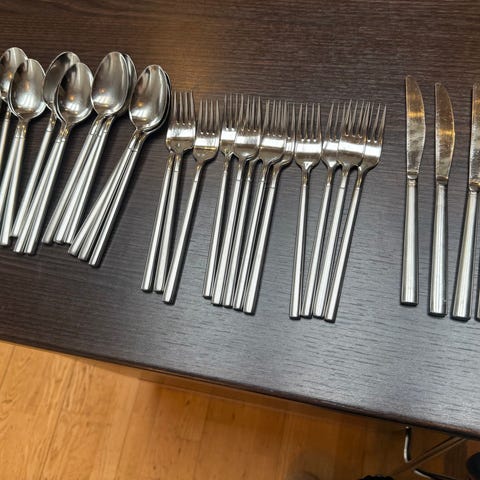 Nyt Raadvad bestil sæt til 12 personer. Bestående af 12 knive, 12 gafler, 12 spiseskeer og 12 teskeer.